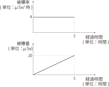 B. <測定開始時からの経過時間>に対する<被曝量>の変化