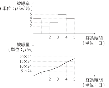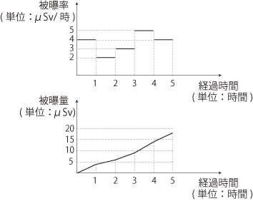 そこで,被曝率 (μSv/時 単位相当) の変化のグラフから,被曝量の累積のグラフがつぎのように導かれる (やっていることは「区分求積」):