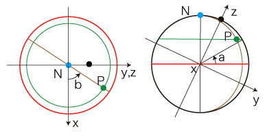 公転軸系直交座標が (x, y, z ) の地点Pの自転軸系経度緯度は? ![]() Pの緯度,経度を,それぞれa, bとする: ![]() ベクトルu, v, w を,つぎのようにとる: ![]() Pの位置ベクトルをx とするとき, ![]()