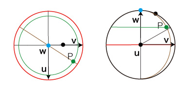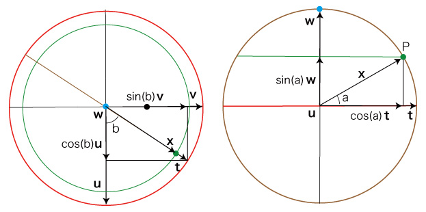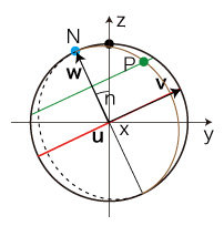 以下,つぎの略記を用いる: \[ \begin{align} n_s = sin(n), &\quad n_c = cos(n) \\ a_s = sin(a), &\quad a_c = cos(a) \\ b_s = sin(b), &\quad b_c = cos(b) \\ \ \\ \end{align} \] u, v, w の座標は: \[ {\bf u} = (1, 0, 0) \\ {\bf v} = (0, cos(n), sin(n)) \\ {\bf w} = (0, -sin(n), cos(n)) \\ \] ![]()