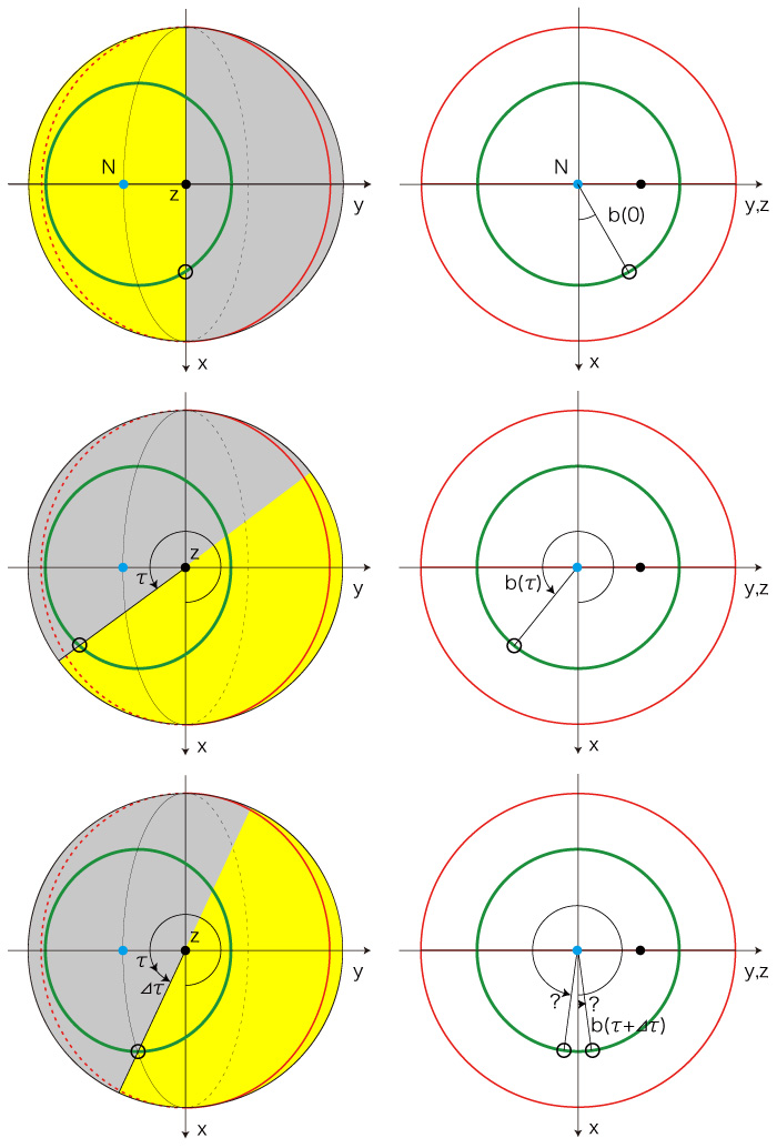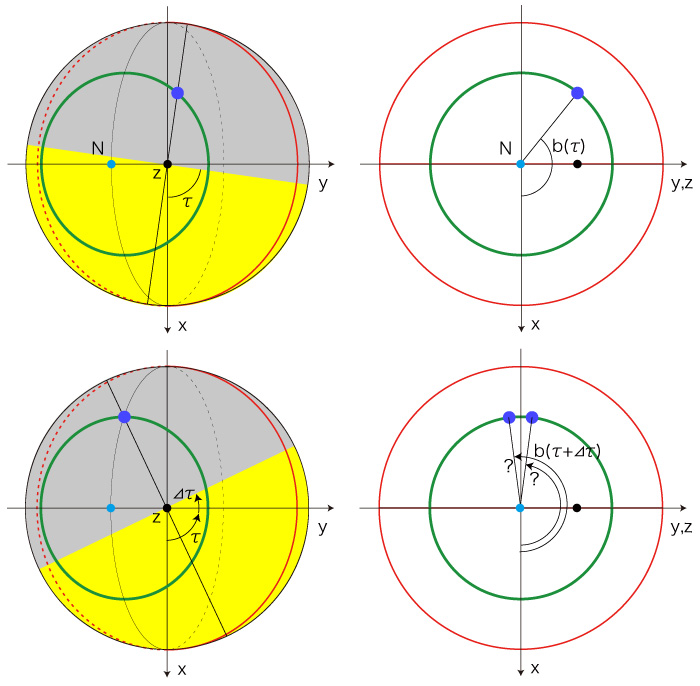 b(τ) は余弦方程式の解として計算され,解はつぎの3通りになる: 2つの解α,2π−α の場合,どちらが b(τ) であるのかの判別が問題になる。 実際,α が0, π に近いときは,見た目では判別できない。 ![]() 日出の場合 ![]() 2つの解のどちらが適する解であるかの判別は,以下がこれの方法になる。 はじめに, \[ cos( b(\tau_0) ) = 1 \\ cos( b(\tau_{\pi}) ) = -1 \] となる \( \tau_0), \ \tau_{\pi} \) を求める。 そして,つぎのように判定する: