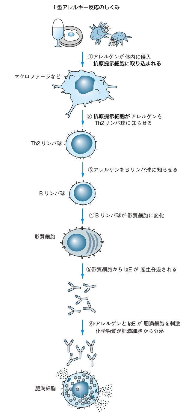 これらの細胞は今度はあいさつをしなくてよいダニの死骸や花粉、ハウスダストなどにあいさつするようになって、アレルギー性疾患が出現したというわけだ。