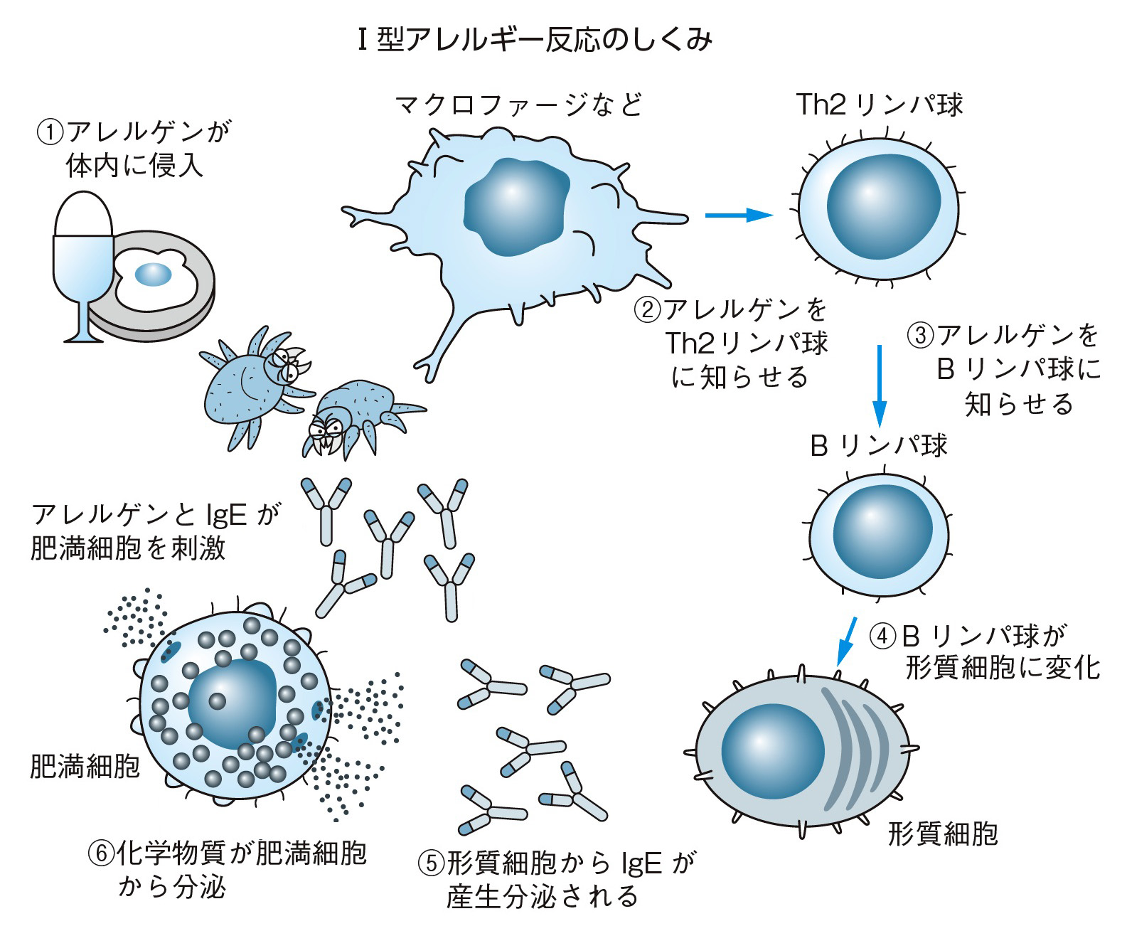B細胞が形質細胞に分化して,主にIgE を産生すれば,Ⅰ型アレルギー反応ですし,IgG,IgM を産生すれば,Ⅱ型,Ⅲ型アレルギー反応です.