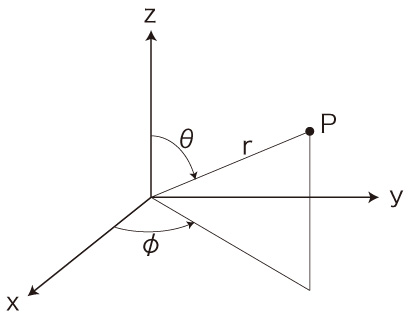 ![]() \[ x = r\ sin \theta\ cos \phi \\ y = r\ sin \theta\ sin \phi \\ z = r\ cos \theta \\ \] \[ \dot{x} = \frac{ \partial x }{ \partial r }\ \dot{r} + \frac{ \partial x }{ \partial \theta }\ \dot{\theta} + \frac{ \partial x }{ \partial \phi }\ \dot{\phi} \\ = sin \theta\ cos \phi\ \dot{r} + r\ cos \theta\ cos \phi\ \dot{\theta} - r\ sin \theta\ sin \phi\ \dot{\phi} \\ \ \\ \dot{y} = \frac{ \partial y }{ \partial r }\ \dot{r} + \frac{ \partial y }{ \partial \theta }\ \dot{\theta} + \frac{ \partial y }{ \partial \phi }\ \dot{\phi} \\ = sin \theta\ sin \phi\ \dot{r} + r\ cos \theta\ sin \phi\ \dot{\theta} + r\ sin \theta\ cos \phi\ \dot{\phi} \\ \ \\ \dot{z} = \frac{ \partial z }{ \partial r }\ \dot{r} + \frac{ \partial z }{ \partial \theta }\ \dot{\theta} \\ = cos \theta\ \dot{r} - r\ sin \theta\ \dot{\theta} \\ \] \[ L( x, y, z; \dot{x}, \dot{y}, \dot{z} ) \\ = \frac{ 1 }{ 2 }\ m\ ( \dot{x}^2 + \dot{y}^2 + \dot{z}^2 ) - V( x, y, z ) \\ \ \\ = \frac{ 1 }{ 2 }\ m\ ( \\ \quad\ ( \dot{r}\ sin \theta\ cos \phi + r\ \dot{\theta}\ cos \theta\ cos \phi - r\ \dot{\phi}\ \ sin \theta\ sin \phi )^2 \\ \quad\ + ( \dot{r}\ sin \theta\ sin \phi + r\ \dot{\theta}\ cos \theta\ sin \phi + r\ \dot{\phi}\ sin \theta\ cos \phi )^2 \\ \quad\ + ( \dot{r}\ cos \theta - r \dot{\theta}\ \ sin \theta )^2 \\ \quad\ ) \\ \quad\ - V( x, y, z ) \\ \ \\ = \frac{ 1 }{ 2 }\ m\ ( \\ \quad\ \dot{r}^2\ sin^2 \theta\ cos^2 \phi + r^2\ \dot{\theta}^2\ cos^2 \theta\ cos^2 \phi + r^2\ \dot{\phi}^2\ \ sin^2 \theta\ sin^2 \phi \\ \quad + 2\ r\ \dot{r}\ dot{\theta}\ cos \theta\ sin \theta\ cos^2 \phi - 2\ r^2\ \dot{\theta}\ \dot{\phi}\ cos \theta\ sin \theta\ cos \phi \ sin \phi - 2\ r\ \dot{\phi}\ \dot{r}\ \ sin^2 \theta\ cos \phi\ sin \phi \\ \quad + \dot{r}^2\ sin^2 \theta\ sin^2 \phi + r^2\ \dot{\theta}^2\ cos^2 \theta\ sin^2 \phi + r^2\ \dot{\phi}^2\ sin^2 \theta\ cos^2 \phi \\ \quad + 2\ r\ \dot{r}\ \dot{\theta}\ cos \theta\ sin \theta\ sin^2\phi + 2\ r^2\ \dot{\theta}\ \dot{\phi}\ cos \theta\ sin \theta\ cos \phi\ sin \phi + 2\ r\ \dot{\phi}\ \dot{r}\ sin^2 \theta\ cos \phi\ sin \phi \\ \quad + ( \dot{r}^2\ cos^2 \theta + r^2 \dot{\theta}^2\ \ sin^2 \theta \\ \quad - 2\ r\dot{r}\ \dot{\theta}\ cos \theta\ sin \theta \\ \quad\ ) \\ \quad\ - V( x, y, z ) \\ \ \\ = \frac{ 1 }{ 2 }\ m\ ( \\ \quad\ \dot{r}^2\ sin^2 \theta\ cos^2 \phi + \dot{r}^2\ sin^2 \theta\ sin^2 \phi + \dot{r}^2\ cos^2 \theta \\ \quad\ + r^2\ \dot{\theta}^2\ cos^2 \theta\ cos^2 \phi + r^2\ \dot{\theta}^2\ cos^2 \theta\ sin^2 \phi + r^2 \dot{\theta}^2\ sin^2 \theta \\ \quad\ + r^2\ \dot{\phi}^2\ \ sin^2 \theta\ sin^2 \phi + r^2\ \dot{\phi}^2\ sin^2 \theta\ cos^2 \phi \\ \quad\ + 2\ r\ \dot{r}\ \dot{\theta}\ cos \theta\ sin \theta\ cos^2 \phi + 2\ r\ \dot{r}\ \dot{\theta}\ cos \theta\ sin \theta\ sin^2\phi - 2\ r\dot{r}\ \dot{\theta}\ cos \theta\ sin \theta \\ \quad\ - 2\ r^2\ \dot{\theta}\ \dot{\phi}\ cos \theta\ sin \theta\ cos \phi \ sin \phi + 2\ r^2\ \dot{\theta}\ \dot{\phi}\ cos \theta\ sin \theta\ cos \phi\ sin \phi \\ \quad\ - 2\ r\ \dot{\phi}\ \dot{r}\ sin^2 \theta\ cos \phi\ sin \phi + 2\ r\ \dot{\phi}\ \dot{r}\ sin^2 \theta\ cos \phi\ sin \phi \\ \quad\ ) \\ \quad\ - V( x, y, z ) \\ \ \\ = \frac{ 1 }{ 2 }\ m\ ( \dot{r}^2 + r^2\ \dot{\theta}^2 + r^2\ \dot{\phi}^2\ sin^2 \theta ) - V( r, \theta, \phi ) \\ \] \[ p_r = \frac{ \partial L }{ \partial \dot{r} } = m\ \dot{r} \\ p_\theta = \frac{ \partial L }{ \partial \dot{\theta} } = m\ r^2\ \dot{\theta} \\ p_\phi = \frac{ \partial L }{ \partial \dot{\phi} } = m\ r^2\ \dot{\phi}\ sin^2 \theta \\ \] \[ \dot{r} = \frac{ p_r }{ m } \\ \dot{\theta} = \frac{ p_\theta }{ m\ r^2 } \\ \dot{\phi} = \frac{ p_\phi }{ m\ r^2\ sin^2 \theta } \\ \] \[ \begin{align} p_x &= m\ \dot{x} \\ &= m\ ( sin \theta\ cos \phi\ \dot{r} + r\ cos \theta\ cos \phi\ \dot{\theta} - r\ sin \theta\ sin \phi\ \dot{\phi} ) \\ &= p_r\ sin \theta\ cos \phi + \frac{ p_\theta }{ r }\ cos \theta\ cos \phi - \frac{ p_\phi }{ r\ sin \theta }\ \ sin \phi \\ \ \\ p_y &= m\ \dot{y} \\ &= m\ ( sin \theta\ sin \phi\ \dot{r} + r\ cos \theta\ sin \phi\ \dot{\theta} + r\ sin \theta\ cos \phi\ \dot{\phi} ) \\ &= p_r\ sin \theta\ sin \phi + \frac{ p_\theta }{ r }\ cos \theta\ sin \phi + \frac{ p_\phi }{ r\ sin \theta }\ cos \phi \\ \ \\ p_z &= m\ \dot{z} \\ &= m\ ( cos \theta\ \dot{r} - r\ sin \theta\ \dot{\theta} ) \\ &= p_r\ cos \theta - \frac{ p_\theta }{ r }\ \ sin \theta \\ \end{align} \] そして \[ x = r\ sin \theta\ cos \phi \\ y = r\ sin \theta\ sin \phi \\ z = r\ cos \theta \] より \[ \frac{ \partial x }{ \partial r } = sin \theta\ cos \phi \\ \frac{ \partial x }{ \partial \theta } = r\ cos \theta\ cos \phi \\ \frac{ \partial x }{ \partial \phi } = - r\ sin \theta\ sin \phi \\ \ \\ \ \\ \frac{ \partial y }{ \partial r } = sin \theta\ sin \phi \\ \frac{ \partial y }{ \partial \theta } = r\ cos \theta\ sin \phi \\ \frac{ \partial y }{ \partial \phi } = r\ sin \theta\ cos \phi \\ \ \\ \ \\ \frac{ \partial z }{ \partial r } = cos \theta \\ \frac{ \partial z }{ \partial \theta } = - r\ sin \theta \\ \frac{ \partial z }{ \partial \phi } = 0 \\ \ \\ \ \\ \frac{ \partial x }{ \partial p_r } = \frac{ \partial x }{ \partial p_\theta } = \frac{ \partial x }{ \partial p_\phi } = 0 \\ \ \\ \frac{ \partial y }{ \partial p_r } = \frac{ \partial y }{ \partial p_\theta } = \frac{ \partial y }{ \partial p_\phi } = 0 \\ \ \\ \frac{ \partial z }{ \partial p_r } = \frac{ \partial z }{ \partial p_\theta } = \frac{ \partial z }{ \partial p_\phi } = 0 \\ \] そして \[ p_x = p_r\ sin \theta\ cos \phi + \frac{ p_\theta }{ r }\ cos \theta\ cos \phi - \frac{ p_\phi }{ r\ sin \theta }\ \ sin \phi \] より \[ \frac{ \partial p_x }{ \partial r } = - \frac{ p_\theta }{ r^2 }\ cos \theta\ cos \phi + \frac{ p_\phi }{ r^2\ sin \theta }\ \ sin \phi \\ \frac{ \partial p_x }{ \partial \theta } = p_r\ cos \theta\ cos \phi - \frac{ p_\theta }{ r }\ sin \theta\ cos \phi + \frac{ p_\phi\ cos \theta }{ r\ sin^2 \theta }\ \ sin \phi \\ \frac{ \partial p_x }{ \partial \phi } = - p_r\ 