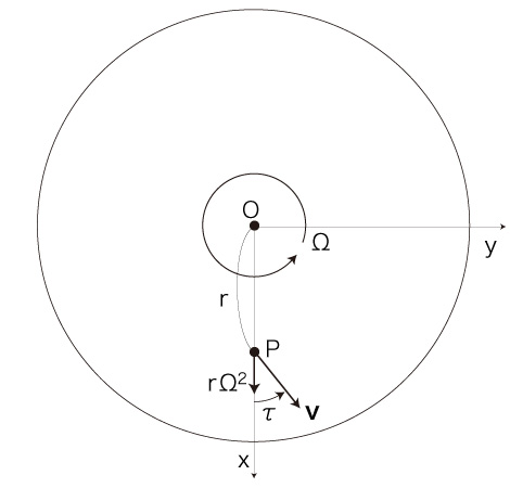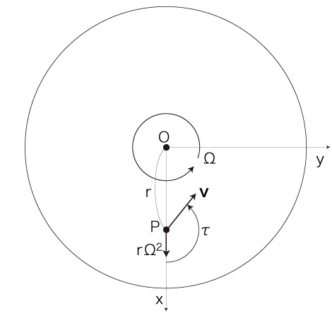なお,自転球体上の移動がカオスになったように,自転円板上の移動──距離 \( r \) と速度 \( \bf{v} \) と加速度 \( r\ \Omega \) の相互フィードバック──も,カオスになりそうに思える。