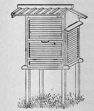 これは,気温計が,<直に受け取ったもの>を気温に表現していくということである。 気温計が直に受け取っているもの,それは放射線である。 気温計は,これが受ける放射線の強度を物理的現象や電気的現象に変換する。 その物理的現象ないし電気的現象が,気温として読まれる。 気温計が受ける放射線は,太陽光の散乱放射線と,様々な物体の<内からの>放射線である。 そして後者の一部として,空気の<内からの>放射線がある。 気温計が示す「気温」は,空気の温度ではない。 気温計が空気の温度を示すのは,空気の<内からの>放射線のみを受け取っている場合であるが,そのような気温系は実現されていない。 気温計が示す「気温」を空気の温度に見立てようとする者は,気温計の設置方法を考えてきた。 そして昔は,「百葉箱」が気温計設置の一般的方法になった。 それはつぎのような形状のものである: ![]() この形状に込めた思いは,「空気の<内からの>放射線以外を,遮断」である。 しかし,「遮断」は錯覚である。 繰り返すが,気温計が示す「気温」は空気の温度ではない。 翻って,「気温」とは気温計が表すものである。