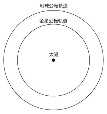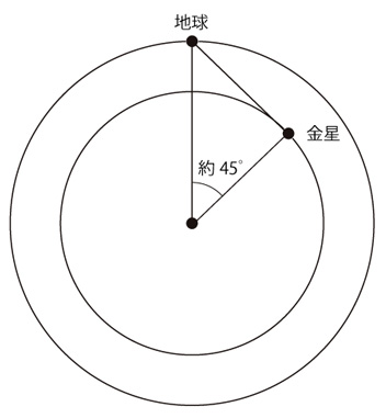 金星の公転半径は,\( 1.082 \times 10^{11} m \) 縮尺で書くとつぎのようになる: ![]() 金星が地平線から最も早い時刻に昇るとき,その金星の位置は: ![]() 1.082 ÷ 1.496 = 0.7232 ≒ sin 46.3゜= sin 45゜ この金星が地平線から昇るのを赤道上で見るとき,その時刻は約3時: ![]() 同様に,赤道上で地平線に最も遅い時刻に沈む金星を見るとき,その時刻は約21時: ![]() |