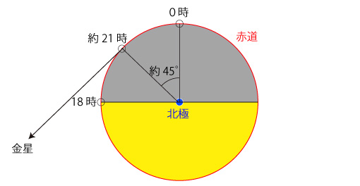 金星の公転半径は,\( 1.082 \times 10^{11} m \) 縮尺で書くとつぎのようになる: ![]() 金星が地平線から最も早い時刻に昇るとき,その金星の位置は: ![]() 1.082 ÷ 1.496 = 0.7232 ≒ sin 46.3゜= sin 45゜ この金星が地平線から昇るのを赤道上で見るとき,その時刻は約3時: ![]() 同様に,赤道上で地平線に最も遅い時刻に沈む金星を見るとき,その時刻は約21時: ![]() |