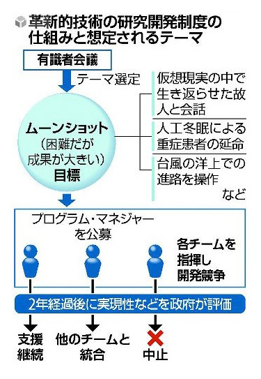 国にとって「テクノロジー」の意味は,国の「競争力」である。 国は,「自国発の革新的な技術」の開発推進を政策にする。 「競争力」は,つぎの二つでなる: 自由主義政治の政策は,他力本願である。 笛吹きの役回りを己に任じ,笛の音につられてひとが踊り出すことを期す。 曲は,一つしか持ち合わせていない。 「競争原理の導入」である。 かくして「国立大学の法人化」「競争的資金」といったものこれまでにあり,そしてこの度は「ムーンショット型研究開発制度」である。 競争原理の導入は,技術開発推進の方法にはならない。 ひとは,<しのぎ>を考えるようになる。 そしてそもそも「最先端技術を巡っては、米国や中国が政府主導で、猛烈に研究開発を進めている」は,「競争原理の導入」がこれの内容なのではない。 ただし,「競争原理の導入」の言に対し,これの<馬鹿の一つ覚え>を嗤うというのは,筋違いである。 実際,この言には,支出削減の意図がある。 国の経済は,収支で見れば破綻している。 研究への予算配分は,削減していかねばならないのである。 また,「夢の技術」の言に対し,これの<浅知恵>を嗤うというのも,筋違いである。 実際,研究資金配分の肝心は,これが導く経済効果である。 商品経済が成果に向かうプロセスでないように,商品経済下の技術開発推進は成果に向かうプロセスではない。 求められるものは,「好景気」である。 競争原理の導入で,ひとは<しのぎ>にあくせくするようになる。 そしてこれこそが,成果なのである。 実際,これが「好景気」の形である。 競争原理の導入は,技術開発推進の方法にはならない。 しかしそれは,失敗ではない。 競争原理の導入の成果は,《ひとが<しのぎ>にあくせくする》という形の「好景気」の実現である。 これに対し無意味を嘆くのは,筋違いである。 商品経済は,無意味である。 <生きる>は,無意味である。 元来無意味なものに意味をつけることを,「幻想」という。 その意味が集団の員に共有される意味であるとき,「共同幻想」という。 「競争原理の導入」「夢の技術」は,共同幻想である。 そしてマスメディアは,共同幻想の旗振りが役回りである: