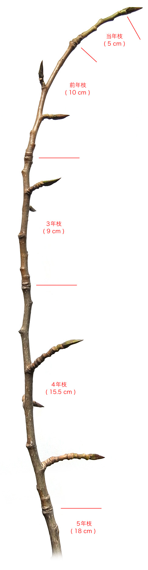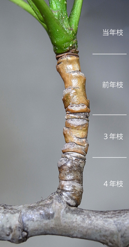 分枝部分は当年枝から5年枝まで (即ち, 6年枝からの枝分かれ)