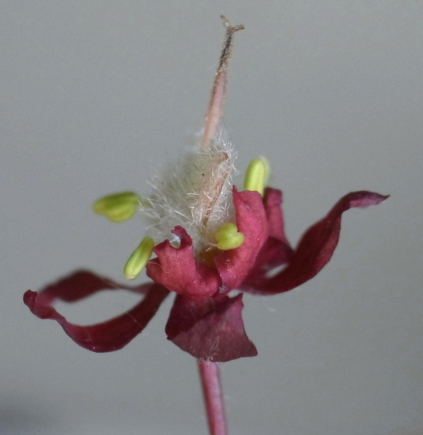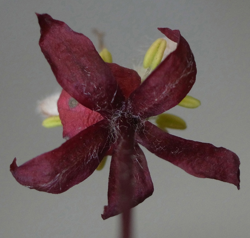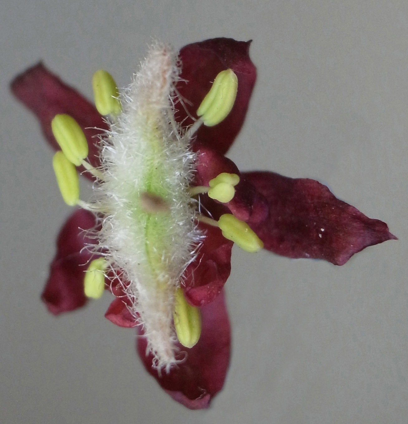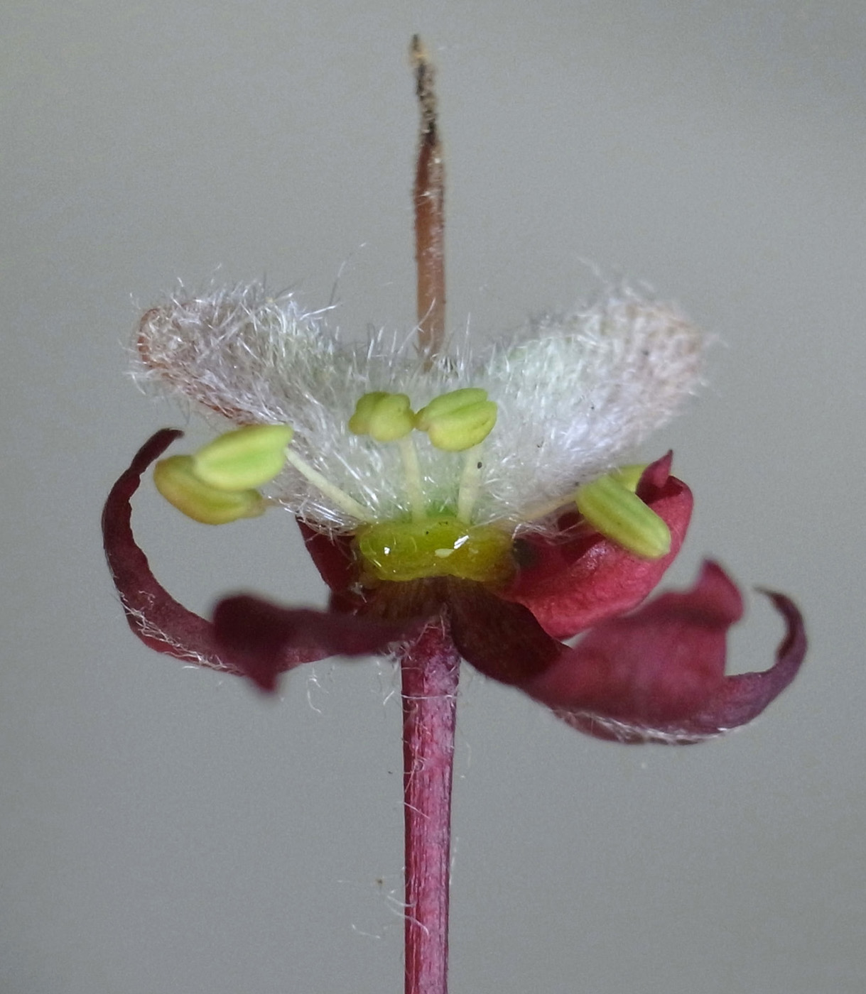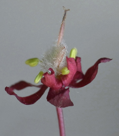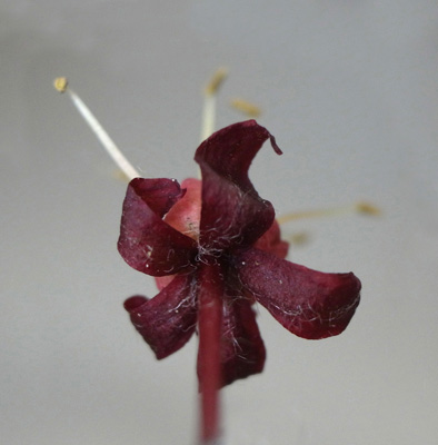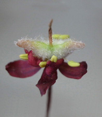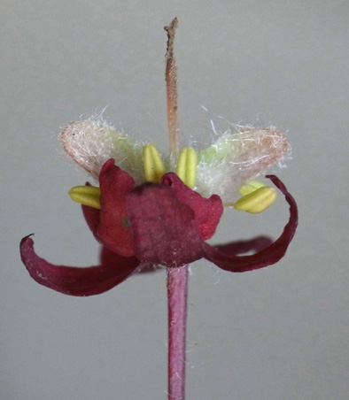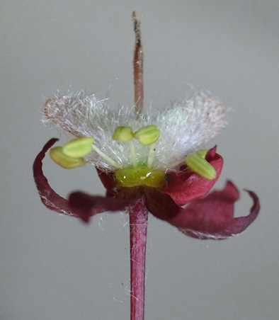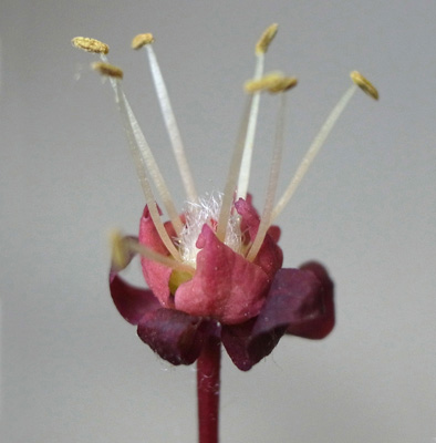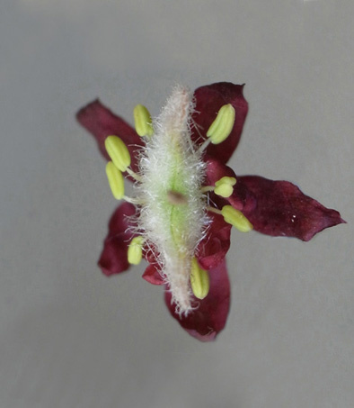 雌花 : 短い花糸をもつ雄しべが8本と,雌しべがある