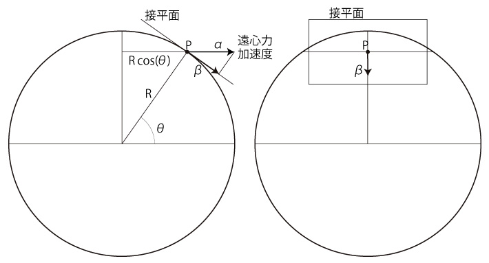 緯度 \( \theta \) の点 \( P \) での遠心力 \( \alpha(\theta) \) は,