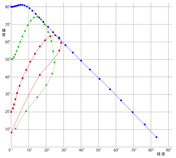 この軌道大円変更の連続が,グラフでは「北に進み,それから南に方向転換」のように見えるということである。
