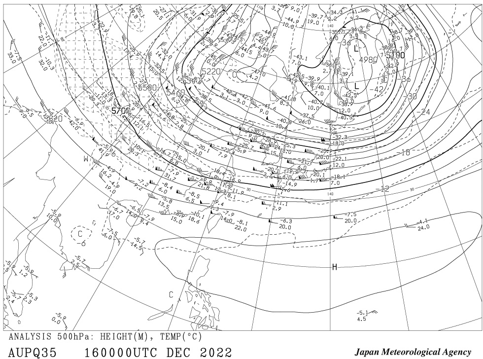 つぎは,気象庁のウェブサイトからダウンロードした高層天気図 AUPQ35 の 500hPa 天気図: