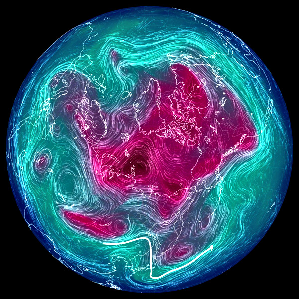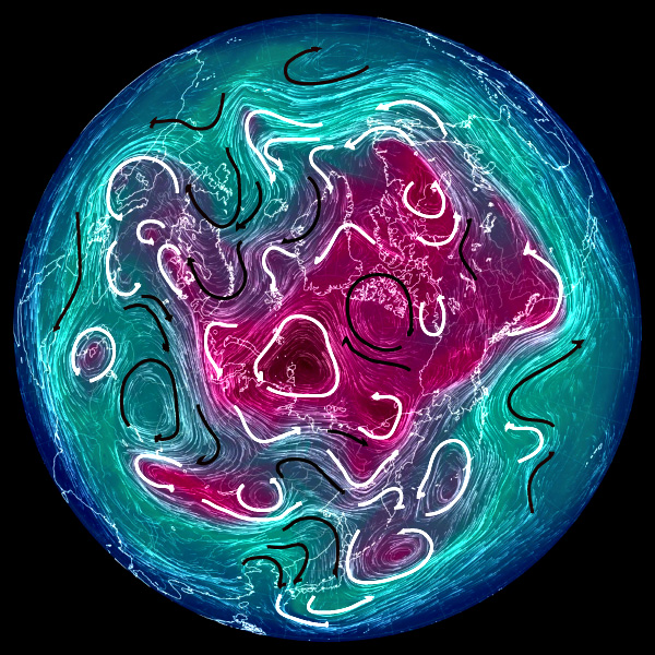 こうして,その等高度線からは,つぎの3つが同時に読めることになる: 実際,北半球 500 hPa 面天気図は,つぎのようになる: