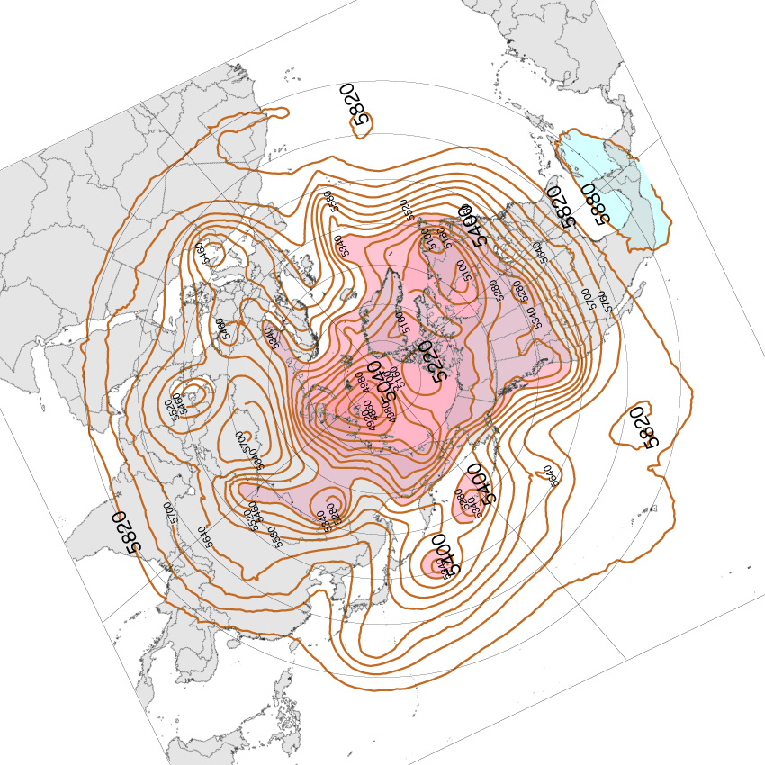 「寒いところから流れてくる風か,それとも暖かいところから流れてくる風か」は,地上天気図からはわからない。 風の流れは,地勢によって大きく攪乱されるからである。 そこで,風の大局的な流れをとらえるために,高層天気図を用いる。 高層天気図は,日本の「気温が日々変化するしくみ」を見ようとするときは,北極中心の北半球 500hPa 面天気図を用いることになる。 以下「高層天気図」と言うときは,これを指す。 地上天気図には等圧線 (等気圧線) が書かれている。 「気圧」とは何か。 空気粒子の密度──濃い・薄い──である。 地上天気図と高層天気図の大きな違いは,「等圧線」に代わって「等高度線」になっていることである。 500hPa 高層天気図だと,「この地点は,上空 ○m が 500hPa」を観測し,その高度が同じになる地点を線でつなげる。 これが「等高度線」である。 ![]()